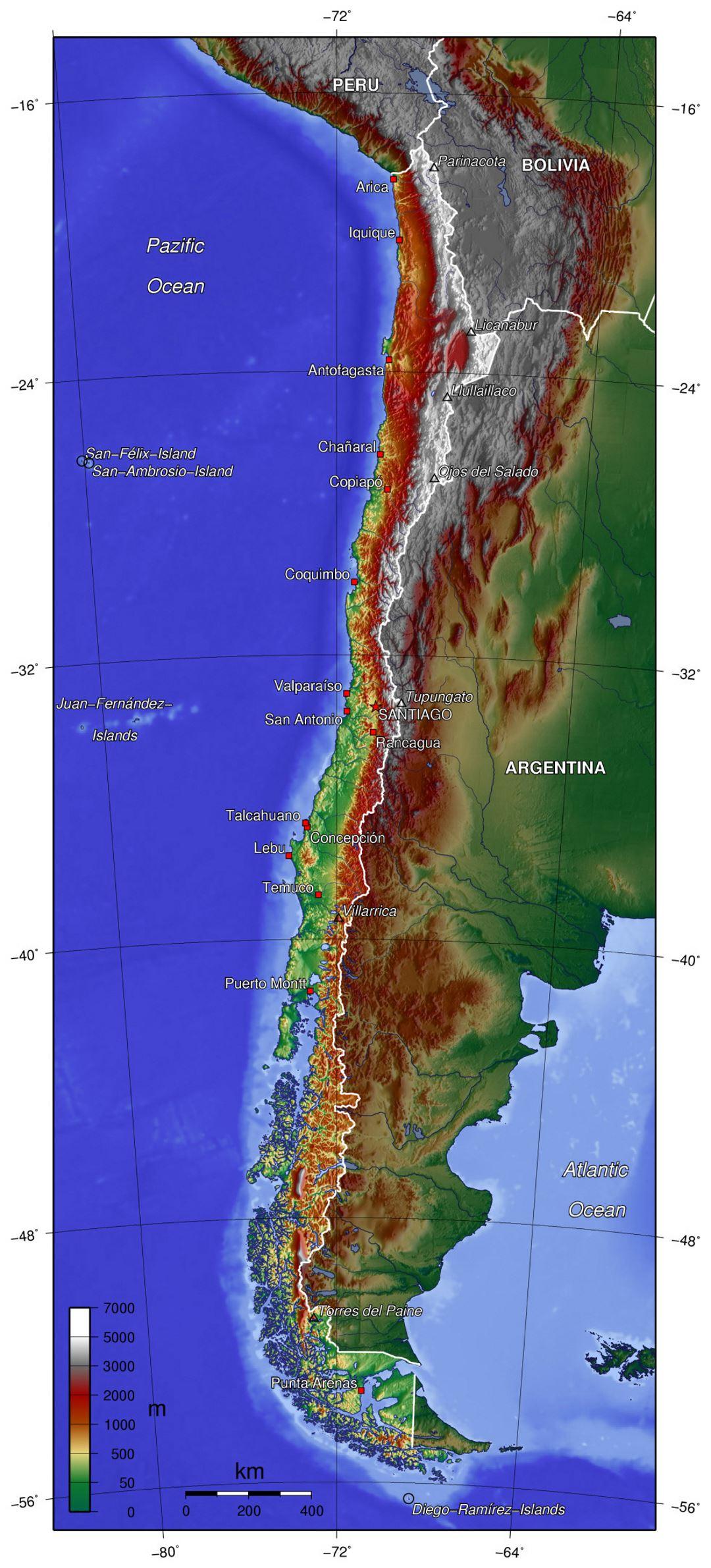 Chile geografia. Fizyczna mapa Chile (Ameryka Południowa - Ameryka) do druku. Fizyczna mapa Chile (Ameryka Południowa - Ameryka) pobierz.